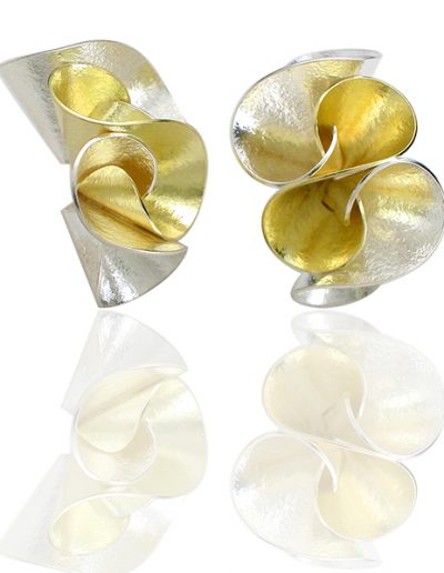 “Nature provides an endless reference for imagination and invention. The linear quality of stems and the fullness of flower buds inspire my jewelry. I enjoy integrating mechanics with design, allowing each piece to function in a visually intriguing way. I work with multiples of the same shape engineering them to fit precisely giving an abstract impression of their botanical origin. Many years of metalsmithing have taught me the power of simplicity. My forms begin as flat metal shapes and arrive as small sculptures. Their complexity is in their conception as curving planes of origami.” -Jayne Redman